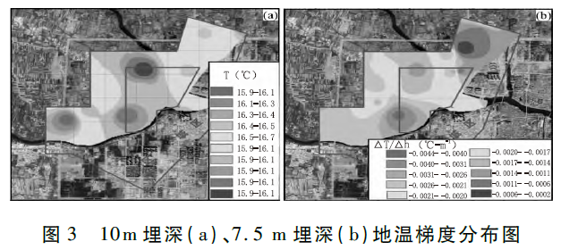 考慮淺部地溫受多因素影響,為有效識別淺層地溫異常區(qū)域,本次求取了7.5m埋深處地溫梯度公式(1),并繪制了7.5m埋深地溫梯度暈圖。由圖3(b)可見可見,7.5m埋深