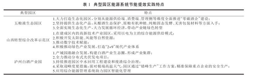 園區(qū)在推動(dòng)我國(guó)實(shí)體經(jīng)濟(jì)發(fā)展和城鎮(zhèn)化發(fā)展中發(fā)揮了關(guān)鍵作用,是支撐制造強(qiáng)國(guó)戰(zhàn)略的主戰(zhàn)場(chǎng)。有研究表明,園區(qū)二氧化碳排放量約占全國(guó)總排放量的31%[4],園區(qū)是資源能源消耗最集中的地方?,F(xiàn)階段,為了節(jié)約能源,保護(hù)環(huán)境,我國(guó)各級(jí)園區(qū)都在持續(xù)推動(dòng)綠色低碳發(fā)展。田金平等研究指出我國(guó)工業(yè)園區(qū)節(jié)能提效實(shí)踐創(chuàng)新主要體現(xiàn)在以下5個(gè)方面: ①聚焦重點(diǎn)領(lǐng)域,全過(guò)程系統(tǒng)性推進(jìn)節(jié)能工作。②集中式能源基礎(chǔ)設(shè)施升級(jí)改造,多樣化開(kāi)發(fā)利用余熱、 余壓和能量多級(jí)利用。③積極利用可再生能源,推進(jìn)能源結(jié)構(gòu)轉(zhuǎn)型升級(jí)。④積極開(kāi)展智慧能源探索,實(shí)現(xiàn)能源全過(guò)程精細(xì)化管理。⑤建立健全能源管理體系。表1為典型園區(qū)能源系統(tǒng)節(jié)能提效實(shí)踐特點(diǎn)。