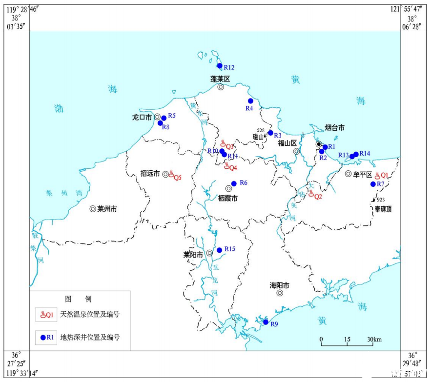 煙臺市地?zé)崽?/a>多以點(diǎn)狀形式出露在兩組或者多組斷裂交匯帶附近,屬于低溫開放式對流型帶狀熱儲地?zé)崽?/a>。目前,煙臺市共有天然溫泉5處、地?zé)?/a>深井15處。煙臺市已查明地?zé)崃黧w可開采量約650萬立方米/年,熱資源量為1.65×10^15焦耳/年,相當(dāng)于標(biāo)準(zhǔn)煤5.62萬噸/年。