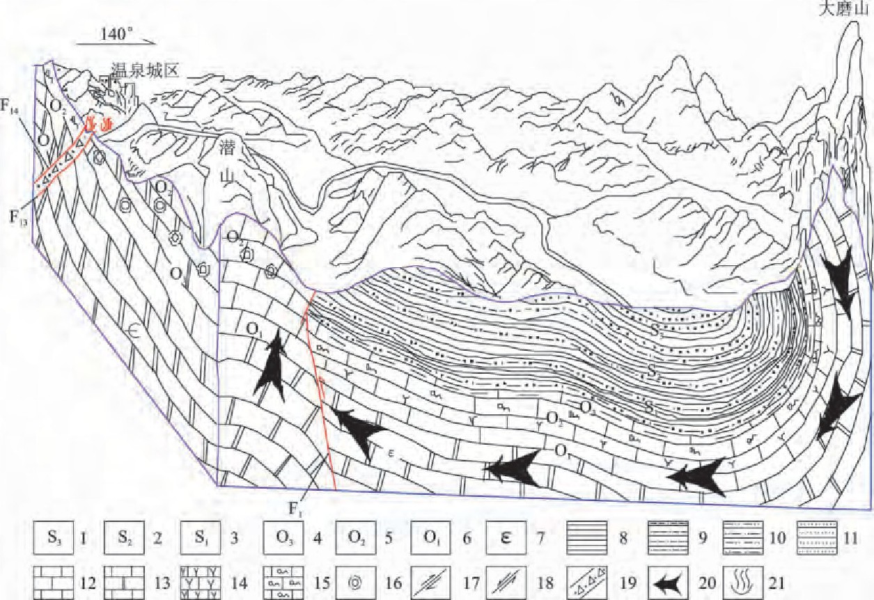 咸寧地質(zhì)構(gòu)造位置處于揚子準(zhǔn)地臺梁子湖坳陷與咸寧臺褶束的交接部位,從屬于大幕山復(fù)式背斜北翼的次級構(gòu)造—高橋向斜、孫鑒鋪倒轉(zhuǎn)背斜、賈家山倒轉(zhuǎn)向斜的西延部分,由一系列的緊密褶皺組成區(qū)內(nèi)的基本構(gòu)造骨架。新華夏晚期構(gòu)造體系在潛山一帶表現(xiàn)強(qiáng)烈,其中大義山式斷裂有明顯的反映。這些不同的構(gòu)造體系互相干擾、復(fù)合,不僅控制了區(qū)內(nèi)的巖性組合、地貌、巖溶發(fā)育,而且也嚴(yán)格控制了地下水的分布及其補(bǔ)給、運移和排泄。潛山背斜是地?zé)崽?/a>的主要構(gòu)造骨架,其特點是呈梳狀,且向南東倒轉(zhuǎn),區(qū)內(nèi)溫泉斷裂規(guī)模最大,且是經(jīng)過多次構(gòu)造變動的復(fù)合性斷裂,先期為縱張斷裂且以垂直運動為主,后期表現(xiàn)為逆向復(fù)合,并受逆時針的應(yīng)力作用而顯壓扭性特征,是深切割斷裂,也是控制區(qū)內(nèi)地?zé)崃黧w分布的主要斷裂。