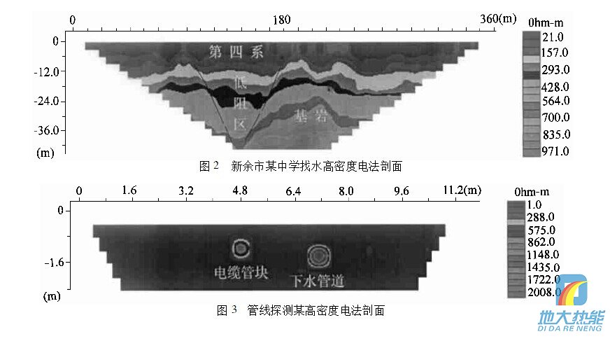 (1)高密度電法找水 新余市某鎮(zhèn)中學生活用水為淺層第四系水,秋、冬季為枯水期用水困難。據(jù)校方介紹,為解決水源問題,多次聯(lián)系成井單位想取基巖構(gòu)造水成井,并進行過常規(guī)電法找水工作,均未成功。我院受校方委托,為了解校區(qū)賦水構(gòu)造發(fā)育情況,采用了高密度電法開展工作。