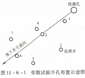 試驗(yàn)在沿地下水流向上布置的試驗(yàn)井組[投源井(注入井)及若干觀測(cè)井]中進(jìn)行,見(jiàn)圖11 -6 -1。